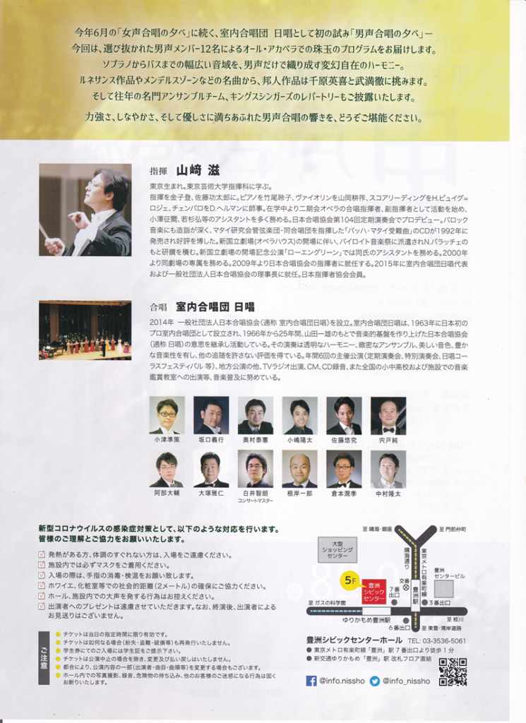室内合唱団 日唱 第36回定期演奏会 男声合唱の夕べ 湘南男声合唱団 2022年10月13日 2022年11月1日 室内合唱団 日唱 第36回定期演奏会 日時:2022年10月28日(金) 19:00開演(18:30開場) 会場:豊洲シビックセンターホール